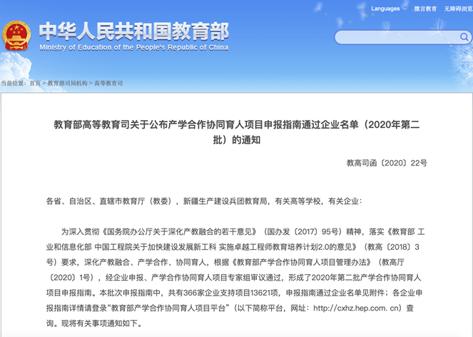为进一步深化产教融合、产学合作、协同育人,经企业申报、产学合作协同育人项目专家组审议,教育部高教司近期公布了“产学合作协同育人项目申报指南通过企业名单(2020年第二批)”。尊龙时凯网络积极响应教育部高等教育司的号召,在此次的项目中,将对“基于桌面云的实训教学环境建设”、 “基于互动教学软件的教学信息化改革实践环境建设” 两种实践条件和实践基地建设项目类型总计80所高校的项目进行针对性的资助。