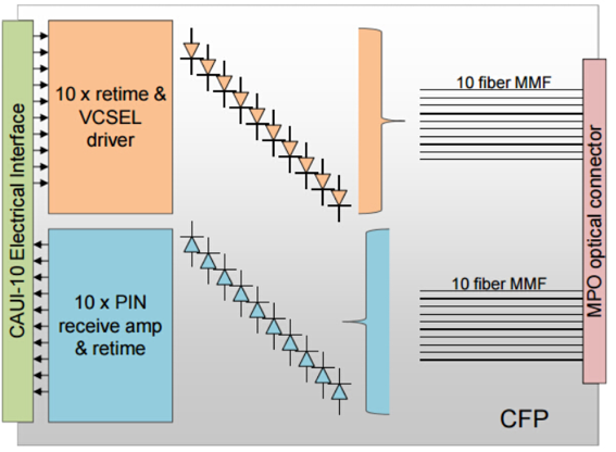 100G短距光模块标准主要有100GBASE-SR10和100GBASE-SR4两种标准。当年为了满足市场上出现的100G需求, 100GBASE-SR10标准最早被提出且应用于100G的短距互联。