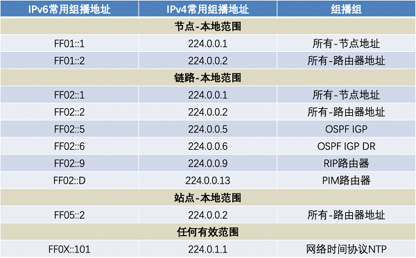 ▲表1:IPv6常用组播地址