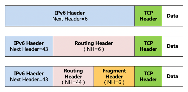 当使用多个扩展报头时,IPv6报头中的“下一报头”字段指明下一个扩展报头的类型,这样就形成了链状的报头列表,如图7所示。