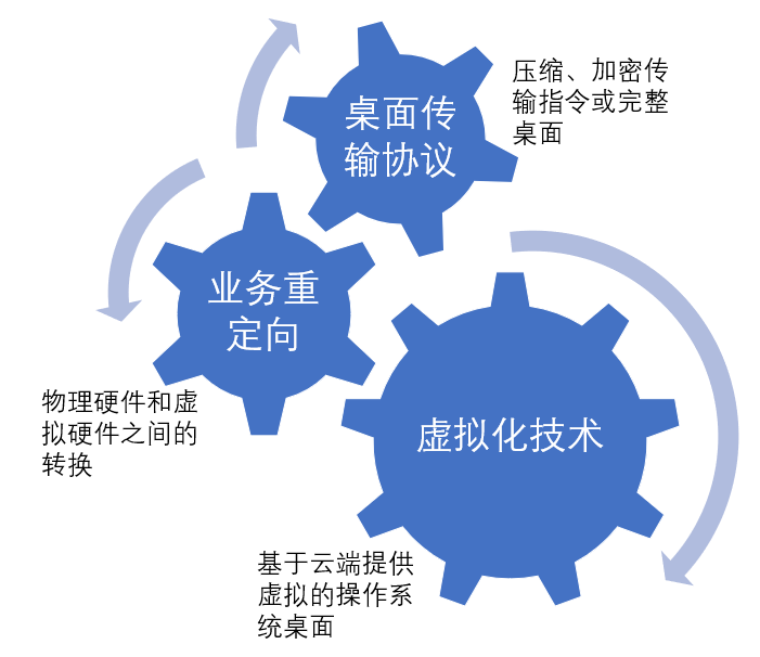 3. 重定向:既然提供给使用者的桌面是在虚拟机中生成的,那么与桌面运行相关的驱动和硬件接口就需要从底层硬件过渡到虚拟机里,重定向技术就是解决这个问题的。