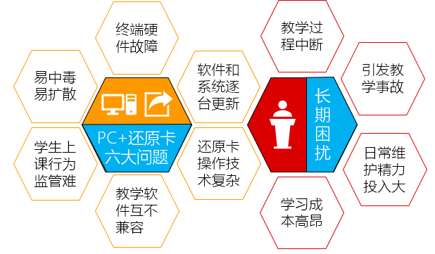 教育局和学校的信息化工作者通常都有双重身份,首先是一名教师,承担了一定的教学工作,其次还是一名信息系统管理员,也就是说这些信息化工作者不但要保障自身的教学效果,也要保证其他教师的教学工作顺利开展。双重身份带来的是不仅是工作量的增加,同时还涉及到学习成本和精力投入。日益增加的教学终端特别是电脑这类各自独立的终端形态,给管理员带来了超负荷的工作,虽然有还原卡等技术的应对,但由于其操作的复杂性和不稳定,又额外增加了学习投入。