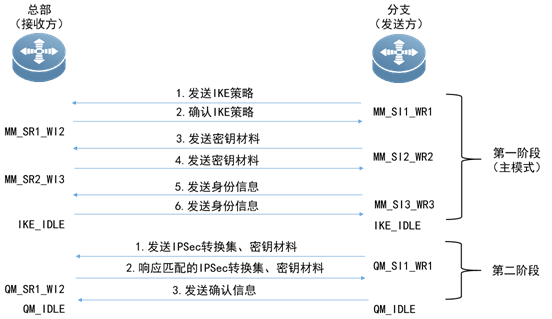 IKE用于动态建立并实时维护IPSec SA。IKE通过两个阶段来建立IPSec SA,第一阶段首先要协商建立IKE SA,第二阶段通过IKE SA协商建立IPSec SA。
