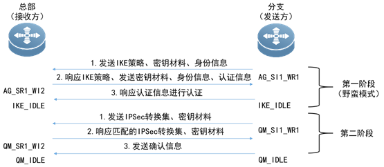 在IKE第一阶段有两种协商模式可协商建立IKE SA,主模式或者野蛮模式。主模式使用6个报文完成IKE SA建立,而野蛮模式使用3个报文完成IKE SA建立,与主模式相比野蛮模式减少交互报文数量从而加快了协商速度,但因对身份信息和认证信息采用明文交互,没有加密保护,因此不安全,作者不推荐使用。