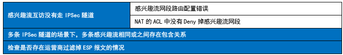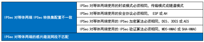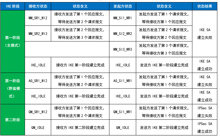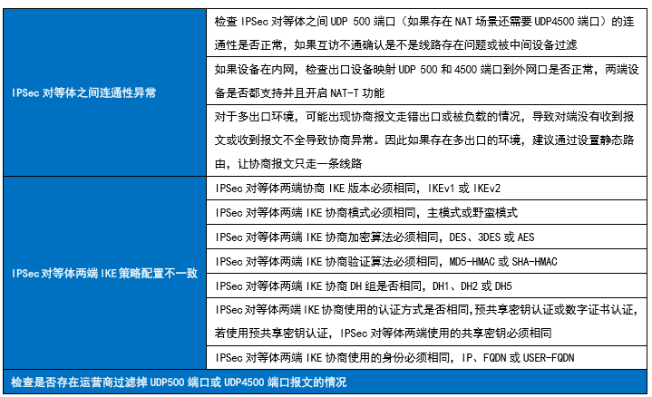 IPSec VPN使用时难免会遇到隧道建立失败的情况。一般IPSec VPN故障可分为三类:IKE SA建立失败;IPSec SA建立失败;IPSec SA建立成功但数据不通。在遇到IPSec VPN故障时读者可查看发起方和接收方状态并对比如下IPSec对等体状态解析图确认属于哪类故障,然后根据每类故障常见原因进行排查。