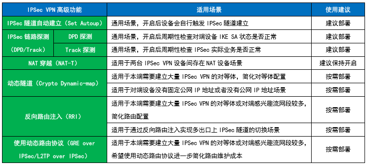 在完成IPSec配置后我们要配置去往对端网段的静态路由,如果感兴趣流网段较多人为手动配置及维护这些路由有些不便。开启反向路由注入功能,当IPSec隧道建立完成后会自动产生相应的静态路由(目的地址是对端感兴趣流地址,下一跳是对端公网IP地址)注入到路由表中,当IPSec隧道断开后对应的路由也会消失。反向路由会结合IPSec隧道的建立信息自动生成对端网段路由,这样便能动态地完成路由的添加与删除,避免大量人为配置。此外,在设备存在多出口场景,还可以通过反向路由注入进行多出口上IPSec隧道的切换。
