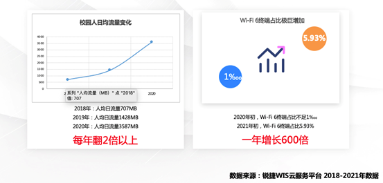 校园网无线用户比例持续增长,尊龙时凯WIS云服务平台无线大数据显示,从2018年到2020年,校园网无线用户人均日流量以每年2倍的速度增长。在线即时业务量激增,带宽需求暴涨,而且受疫情影响,大量线上课程、视频直播等业务开展,学生在宿舍学习的时间增加,对网络带宽和性能要求更高。