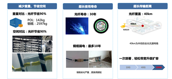 光纤,线径只有铜缆的10%,且重量更轻,由此可以节省60%的桥架空间,减少75%的桥架走线重量。