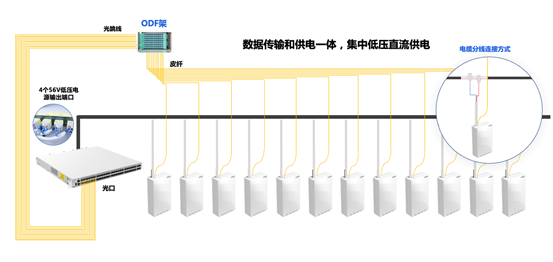 极简以太全光智分+采用集中供电方式,利用全光主机带载的独立供电模块为光AP远程集中供电。全光主机前面板的48个光口通过皮线光缆进行数据传输,尾部通过4根双芯电缆对宿舍AP进行远程供电,每根电缆可以为12台微AP集中供电。